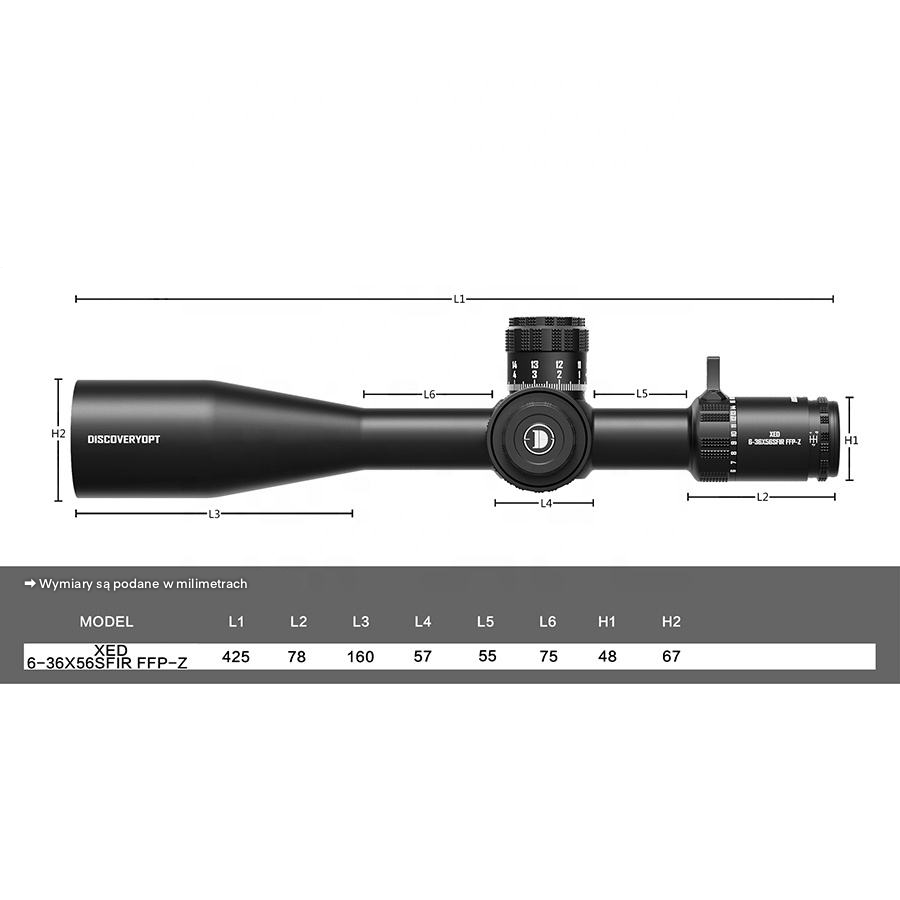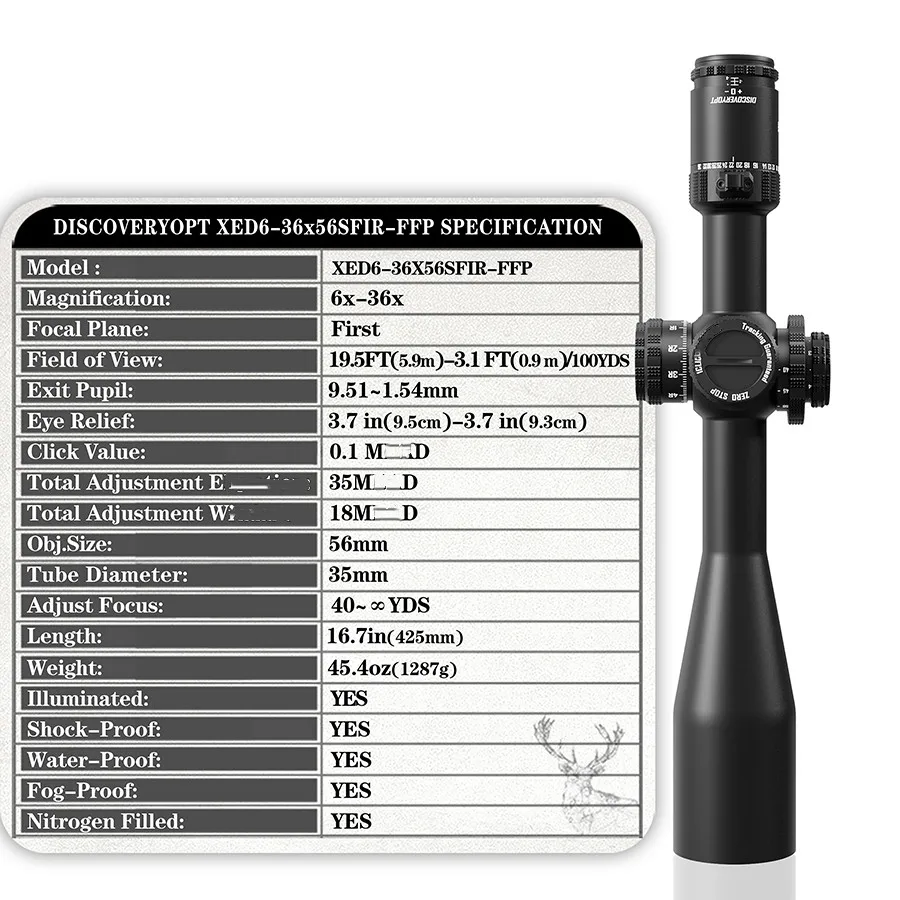 Model XED 6–36×56SFIR FFP-Z MRAD, będący najwyższym modelem tego producenta, korzysta z japońskiego szkła ED o niskiej dyspersji, zapewniającego wysoką jasność i klarowność obrazu, pracuje w pierwszym planie ogniskowym (FFP), ma tubus 35 mm oraz precyzyjne kliknięcia 0,1 MRAD, co predestynuje go do strzelań długodystansowych. Fabrycznie wyposażony w system Zero-Stop (oraz Zero Reset) ułatwia szybki powrót do nastaw zerowych po wprowadzeniu poprawek. Luneta posiada podświetlenie siatki (kolor czerwony, 6 poziomów jasności), a regulacja paralaksy w zakresie 40–∞ yd pomaga uzyskać ostry obraz celu. Konstrukcja jest wodoodporna (IP67), wypełniona azotem i odporna na zaparowanie oraz intensywne użytkowanie (producent deklaruje odporność na odrzut do .50 BMG).